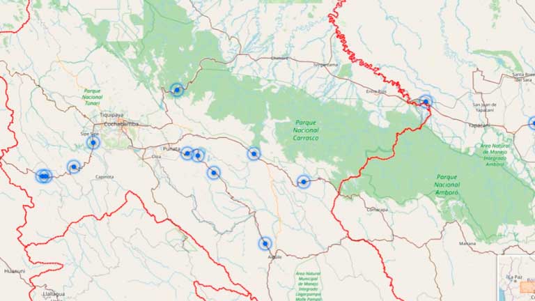 En este departamento, tres puntos se encuentran en controles entre Pongo y Confital, otros tres cerca de Cruce Vacas y Rodeo, uno en el retén Suticollo-Parotani, uno en San Jacinto-Paracti del sector Locotal, uno en el puente Lope Mendoza-Epizana, otro en el puente Copachuncho-Pojo, uno más en la intersección de Aiquile-Cruce Ferrocarril Tajras y finalmente uno en la frontera con Santa Cruz, entre San Germán y el puente Ichilo.