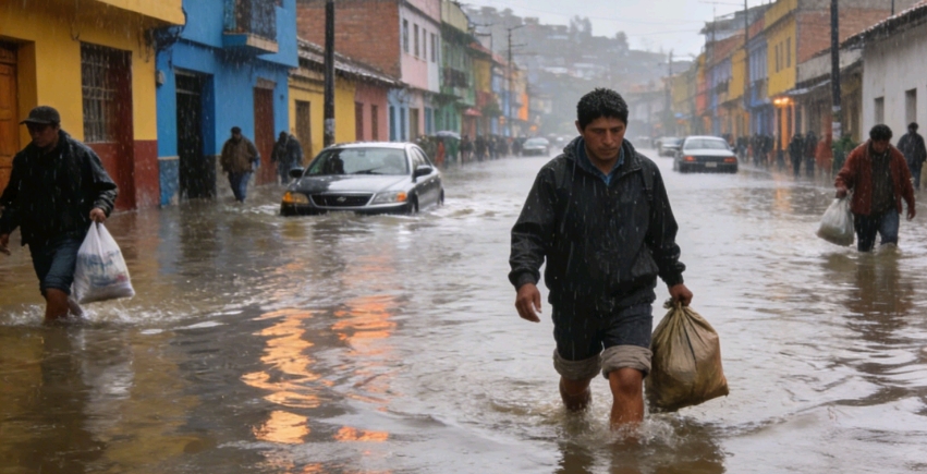 Las intensas lluvias que caen desde la madrugada afectan a la ciudad de Cochabamba, provocando inundaciones en varias calles y avenidas, lo que dificulta el tránsito de vehículos y peatones.